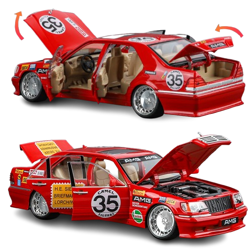 Kolekcjonerski model Mercedes-Benz AMG W140 300SEL w skali 1:24 to dokładnie odwzorowany wariant inspirowany legendarnym “Red Pig” – pierwszym wyścigowym Mercedesem z logo AMG. Samochód prezentuje sportowy charakter poprzez realistyczne oznaczenia sponsorów, szerokie nadkola i niskie zawieszenie typowe dla aut torowych.